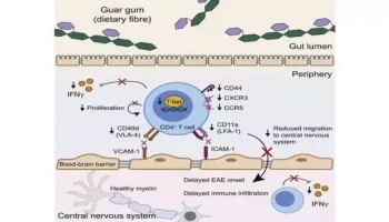 Eats lower in guar gum, a typical food additive and dietary fiber, limited irritation and delayed the beginning of various sclerosis (MS) side effects in