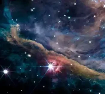 The mass of thick gas and residue looks like a gigantic winged animal, its sparkling throat lit by a brilliant star as it takes off through vast fibers. A worldwide