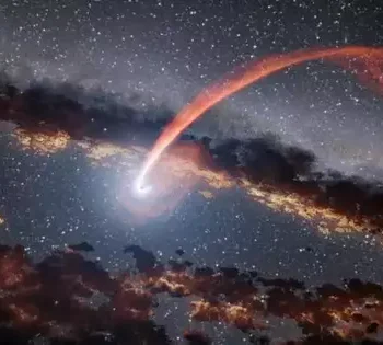 Countless light-years away in a far-off universe, a star circling a supermassive dark opening is fiercely torn apart under the dark opening's huge gravitational force. As the star is destroyed,